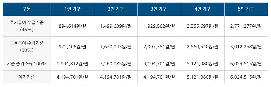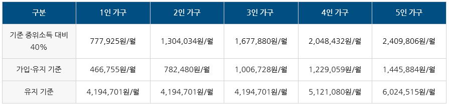 *가입대상을 예를 들면 1인 가구 기준으로 무조건 소득이 적다고 신청가능한것이 아니라 해당 소득기준의 60%이상 즉, 소득이 466,755원~4,197,701원일 경우 신청이 가능하다.