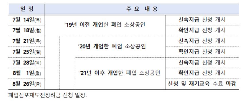 국세청 DB를 통해 사전선별된신속지급 대상의 경우 개업일이 2019년 이전인 폐업 소상공인은 14일부터, 2020년인 경우는 오는 21일부터, 2021년 이후인 경우는 28일부터 신청이 가능하다.